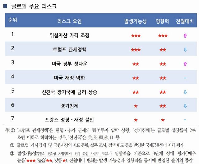 국금센터는 전날(6일) 발간한 월간 보고서인 ‘글로벌 리스크 워치’에서 이번달 주요 리스크 요인 1위로 ‘위험자산 가격 조정’을 꼽으면서, 발생가능성을 ‘매우 높음’으로 평가했다. 지난달에 비해 순위와 발생 가능성을 모두 한 단계씩 상향 조정했다.