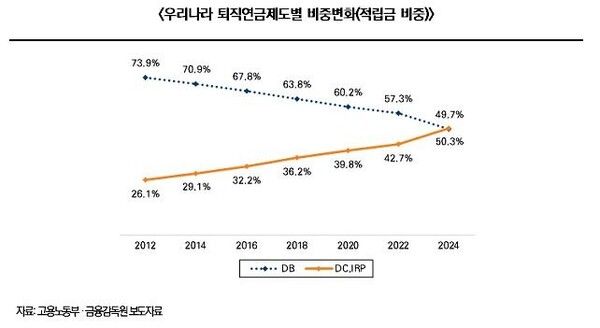 뉴시스 보도에 따르면, 보고서에 따르면 DB형 비중은 2012년 73.9%에서 지난해 49.7%로 낮아져 퇴직연금 도입 이후 처음으로 과반에 미달했다. 이는 임금체계의 구조적 변화로 DB형 퇴직연금의 기대효용이 점차 감소한데 따른 것이다.