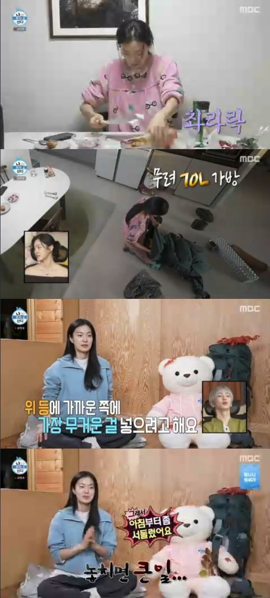 옥자연은 무려 70L의 가방을 꺼내놓고 백패킹에 필요한 짐을 챙기면서 가벼운 짐을 아래로, 무거운 짐을 위로 넣었다.