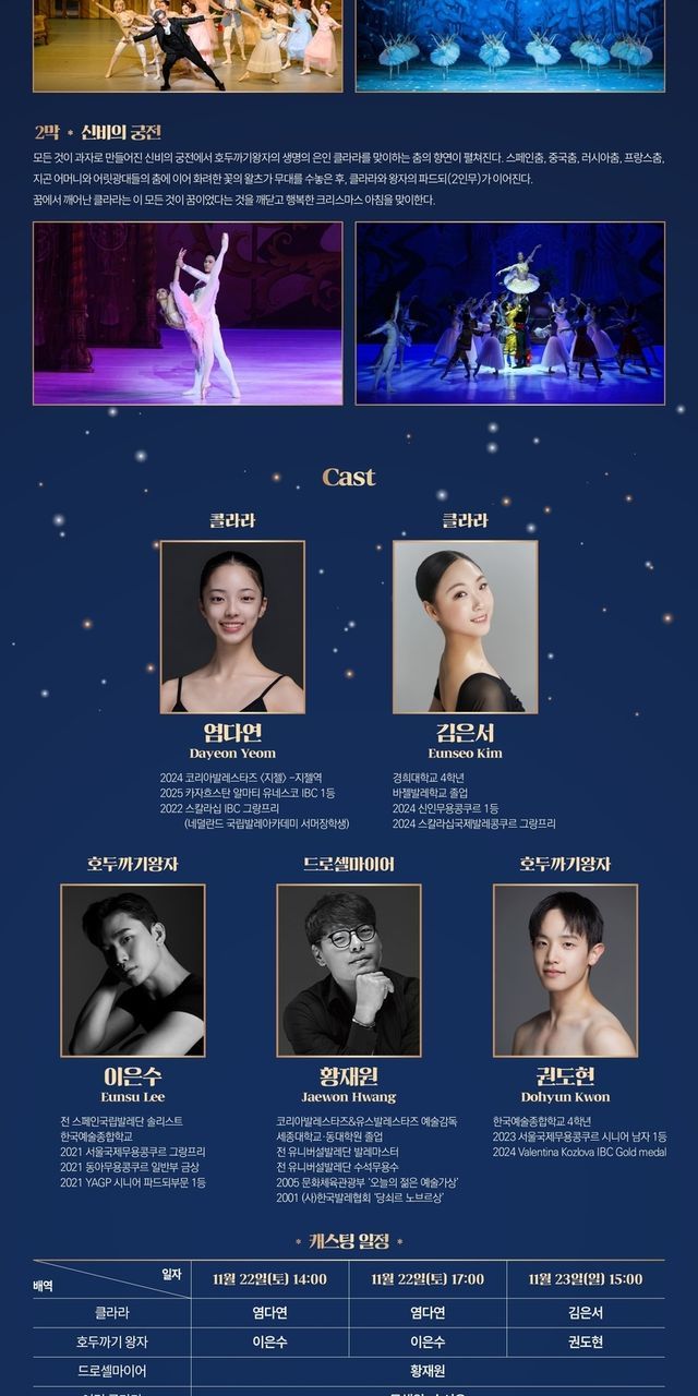 이들은 탁월한 테크닉과 풍부한 감성을 바탕으로 클라라와 호두까기 왕자 역을 맡아 환상적인 무대를 선보일 예정이며, 1막 어린이 장면에는 코리아유스발레스타즈 단원들이 참여하여 작품에 생동감을 더할 것으로 기대를 모은다.