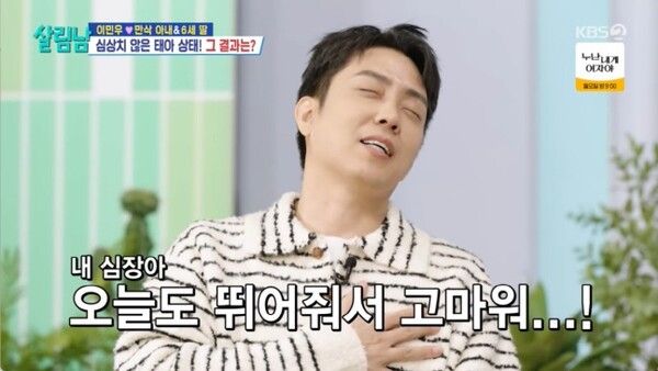 [메디먼트뉴스 김수현 기자] 가수 겸 방송인 은지원이 '살림남'에서 아빠 수업 중인 예비 아빠 이민우의 육아 일상에 깊은 공감을 표했다. 2세를 기다리고 있다고 밝힌 은지원은 6세 딸 등원 준비로 진땀을 흘리는 이민우를 보며 부모의 마음에 동조하는 모습을 보였다.