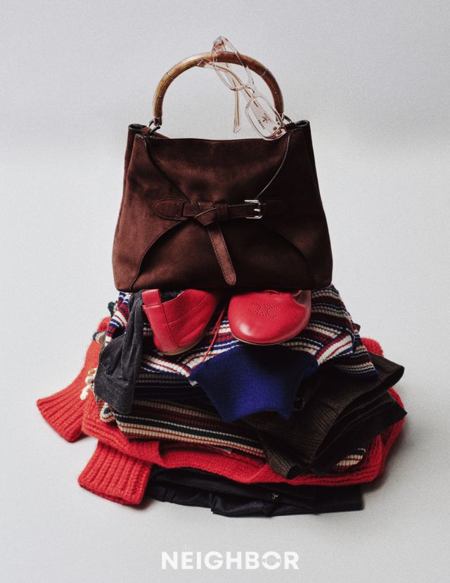 Celine 트리옹프 장식 플랫슈즈 1백45만원, 스트라이프 스웨터 각각 1백70만원, 글렌체크 팬츠 1백95만원, 니트 카디건 3백40만원.
