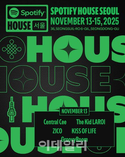 사흘간 이어지는 ‘스포티파이 하우스 서울’에서는 그래미상 후보이자 멀티 플래티넘 아티스트 더 키드 라로이(The Kid LAROI)를 비롯해, 한국 힙합과 R&B 사운드를 대표하는 프로듀서 듀오 그루비룸, 박재범과 그가 제작한 신인 그룹 롱샷(LNGSHOT), 비비, 자이언티, 장기하, 카더가든, 이승윤, 주니, 한로로 등 다양한 아티스트들이 무대에 오른다. 여기에 센트럴 씨, 지코, 키스 오브 라이프까지 새롭게 합류해 한국 음악씬의 다채로움과 생동감을 더욱 풍성하게 기념할 예정이다.
