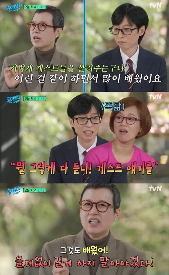 또 박미선은 "재석이랑 방송 같이 하면 정말 많이 배운다"며 '해피투게더' 하면서 '아 저렇게 하면 되는구나', '저렇게 게스트들을 살려주는 구나' 했다. (유재석이) 후배지만 보면서 속으로 많이 기억했다"고 말해 훈훈함을 안겼다.