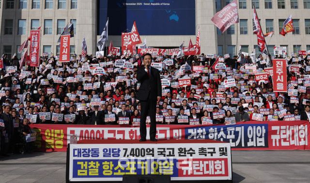 장 대표와 송언석 원내대표 등 국민의힘 의원과 당원들은 이날 서울 여의도 국회 본관 앞에서 열린 ‘대장동 일당 7400억 국고 환수 촉구 및 검찰 항소포기 외압 규탄대회’에서 이같이 비판했다.