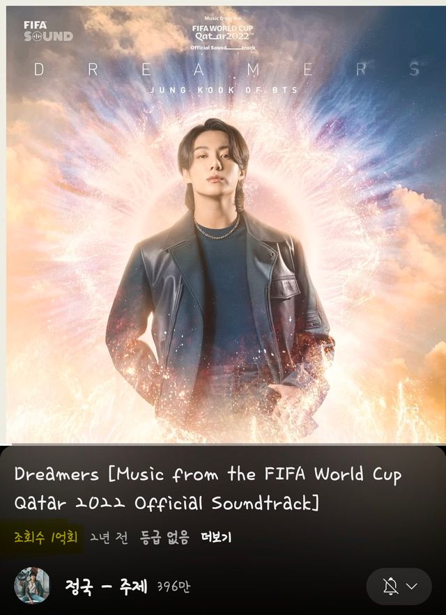 정국이 부른 ‘2022 FIFA 카타르 월드컵’ 공식 사운드트랙 ‘Dreamers’ 오디오 영상이 유튜브 조회수 1억을 돌파했다. 이로써 정국은 1억뷰 오디오 영상을 무려 5개나 보유한 ‘최초이자 유일한’ 아시아 솔로 가수로 이름을 올렸다.