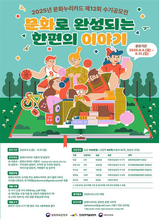 문화체육관광부는 한국문화예술위원회와 함께 '제12회 통합문화이용권(이하 문화누리카드) 수기공모전'을 열어 수상자 30명과 추가로 참가상 50명 등 모두 80명을 선정했다고 12일 밝혔다.