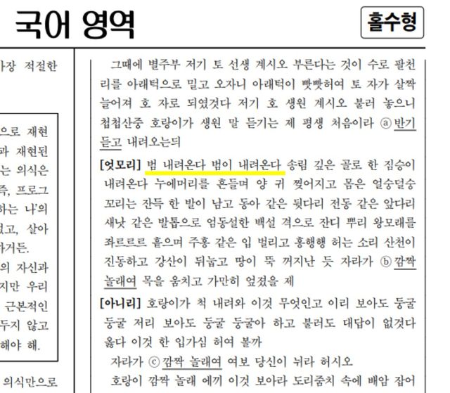 이날 국어영역 18~21번의 ‘수궁가’ 지문은 밴드 이날치의 ‘범 내려온다’ 노래를 연상시켰다는 평을 받았다. '수궁가' 지문에는 엇모리가 “범 내려온다 범이 내려온다 송림 깊은 골로 한 짐승이 내려온다”라고 읊는 구절이 등장하는데, 이날치의 ‘범 내려온다’와 가사와 똑같아 멜로디를 연상시켰단 지적이다.