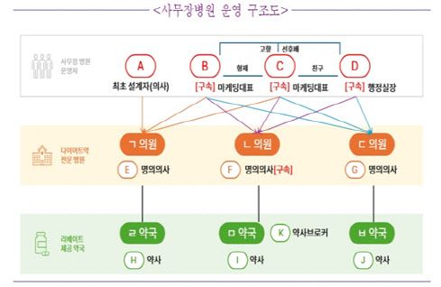 이번 사건의 리베이트 구조는 △마케팅업자와 의사로 구성된 사무장병원 운영진 △실제 병원을 운영한 명의의사 △약사 및 약사 브로커 등 리베이트 제공 약국으로 나뉜다. 운영진과 명의 의사들은 병원 건물 내 약국과 독점 계약을 체결해 처방약 판매액의 50%를 리베이트로 받아 총 16억원 상당을 챙긴 것으로 조사됐다. 이들은 제약사 도매상 3명으로부터 의약품 거래유지 대가로 약 5억원의 리베이트도 수수한 것으로 파악됐다.