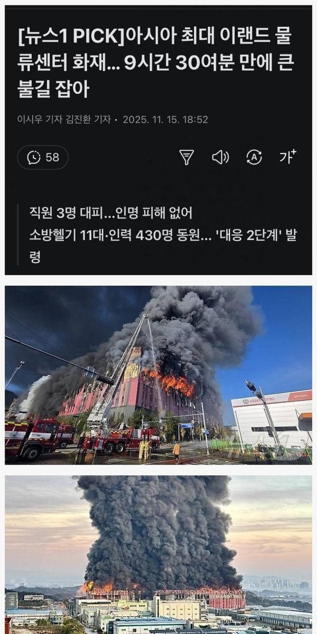 [뉴스1 PICK]아시아 최대 이랜드 물류센터 화재… 9시간 30여분 만에 큰 불길 잡아 - 뉴스1
