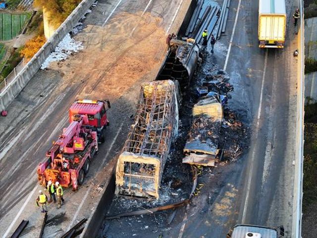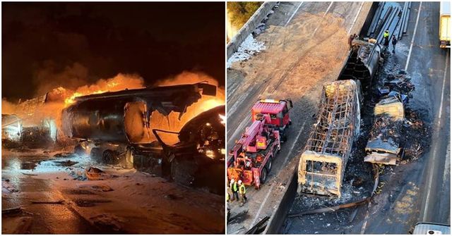 이 과정에서 탱크로리와 14t·2.5t 화물차 등 3대에 화재가 발생해 차량 대부분이 전소됐다.
