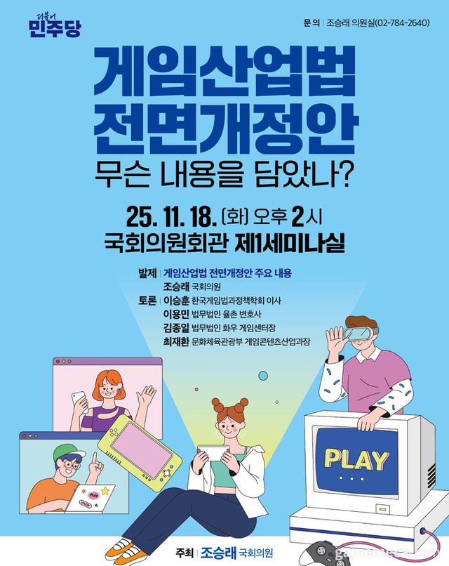 조승래 의원(대전 유성구갑 , 더불어민주당)은 오는 18일 오후 2시, 국회의원회관 제 1세미나실에서 '게임법 전면개정안, 무슨 내용을 담았나?'를 주제로 토론회를 개최한다.