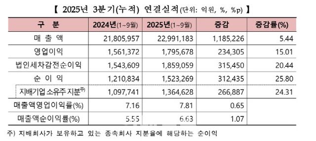 연결 기준으로는 매출액이 783조4704억원으로 2분기 대비 2.7% 증가했고, 영업이익은 69조2163억원으로 33.0%, 순이익은 61조4002억원으로 55.5% 각각 크게 늘었다.