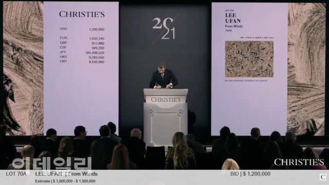 크리스티 뉴욕이 봄·가을로 한 해 두 차례 여는 ‘20세기 이브닝 세일’은 20세기 현대미술 중 최고 수준의 작품이 대거 나서는 자리다. 알베르토 자코메티, 알렉산더 칼더, 파블로 피카소, 마르크 샤갈, 에드바르트 뭉크, 데이비드 호크니 등 세계적인 거장들의 대표작도 이날 함께 거래됐다. 특히 이번 경매에는 김환기의 작품 외에 이우환(89)의 ‘바람으로부터’(1986)도 나서 관심을 끌었다. 한국작가의 미술품이 ‘20세기 이브닝 세일’에 나란히 나선 건 이번이 처음이다. ‘바람으로부터’는 120만달러(약 17억 5848만원)에 낙찰됐다.