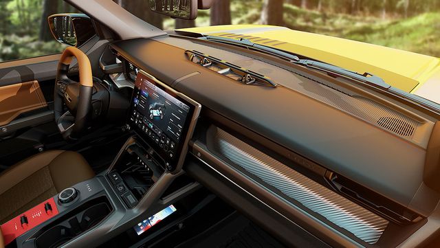 실내는 수평형 대시보드와 보조 손잡이를 중심으로 구성됐다. 대시보드 상단에는 모듈형 액세서리 레일이 배치돼 액세서리 장착이 가능하며, 도어 패널은 분리형 스트랩 구조다. 센터 콘솔은 위 아래로 구성된 2단 수납 구조다.
