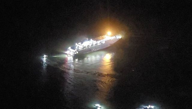 19일 오후 8시 17분쯤 전남 신안군 장산도 남방 족도에 여객선 퀸제누비아2호가 좌초돼 해경이 구조 작업을 벌이고 있다. / 목포해경 제공-연합뉴스