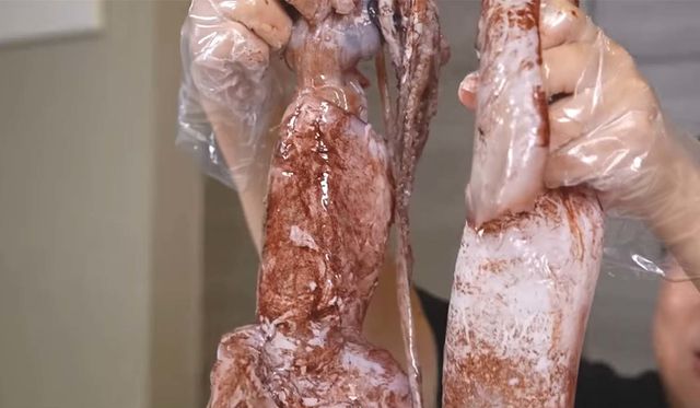 영상 제작자는 속초 관광시장에서 구매한 갈고리흰오징어 4마리를 선보였다. 한 마리당 무게가 약 1kg에 달할 정도로 크기가 상당했다. 늘씬하게 생긴 살오징어와 달리 몸통이 빵빵하고 날개가 옆으로 활짝 펴져 있다. 표면에는 대리석 돌무늬처럼 자글자글한 무늬가 선명하게 나타나는데, 이 무늬가 선명할수록 신선한 상태라고 한다. 신선도가 떨어지면 무늬가 금방 벗겨지면서 쪼글쪼글해지고 주름이 생긴다.