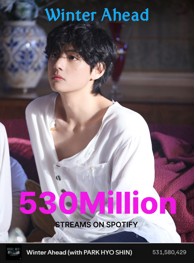 20일 기준 스포티파이 집계에 따르면 ‘윈터 어헤드’는 누적 스트리밍 5억3000만 회를 돌파했다. 뷔는 이 곡을 포함해 ‘러브 미 어게인’, ‘슬로우 댄싱’, ‘FRI(END)S’까지 총 4곡을 5억 이상 스트리밍 반열에 올려두며 강력한 솔로 파워를 입증했다.