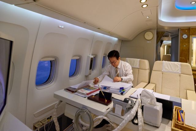 이재명 대통령이 19일(현지시간) UAE 국빈 방문을 마치고 다음 순방지인 이집트로 향하는 공군 1호기 내에서 집무를 보고 있다. / 이재명 대통령 SNS, 뉴스1