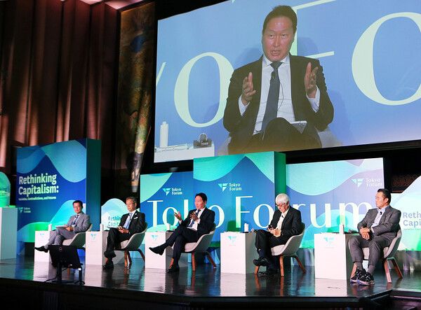 최태원 SK그룹 회장(왼쪽)이 21일 일본 도쿄대 야스다 강당에서 열린 '도쿄포럼 2025'의 비즈니스 리더 세션에 참석해 토론하고 있다. 오른쪽은 이와이 무츠오 일본경제동우회 회장 대행 겸 일본담배산업 이사회 의장 /SK 제공 최태원 SK그룹 회장(왼쪽)이 21일 일본 도쿄대 야스다 강당에서 열린 '도쿄포럼 2025'의 비즈니스 리더 세션에 참석해 토론하고 있다. 오른쪽은 이와이 무츠오 일본경제동우회 회장 대행 겸 일본담배산업 이사회 의장 /SK 제공