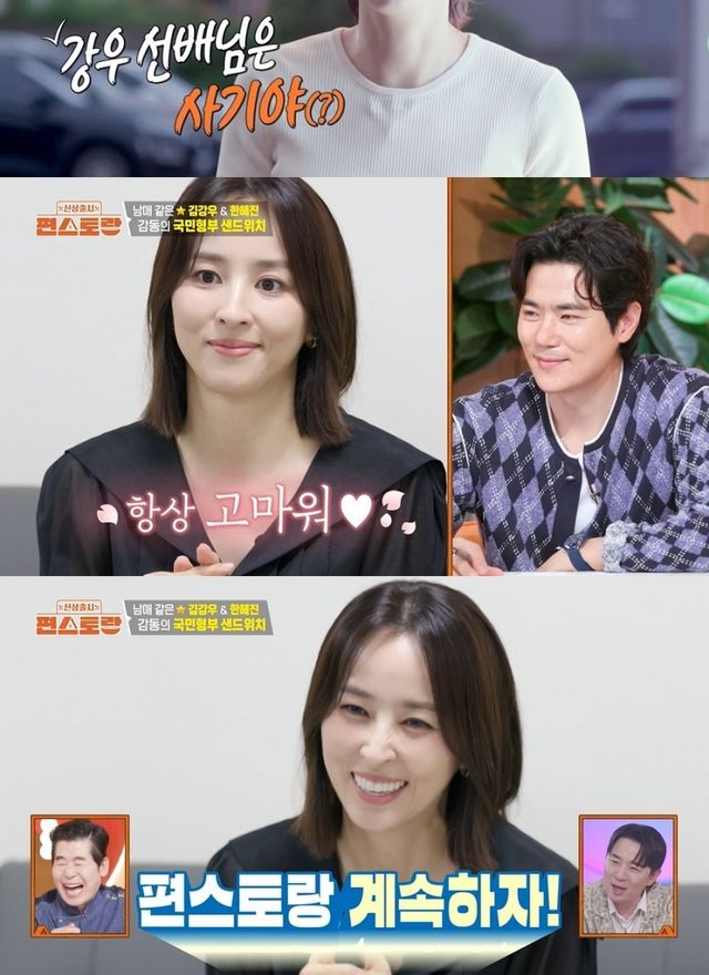 한혜진은 고마운 마음에 곧바로 형부 김강우에게 영상 통화를 걸었다. 두 사람은 마치 친남매처럼 다정하게 대화를 나눠 훈훈함을 자아냈다. 고마워하는 처제 한혜진과 처제를 향해 응원을 아끼지 않는 형부 김강우의 모습이 TV 앞 시청자까지 미소 짓게 했다. 또 한혜진과 함께 드라마 촬영 중인 반가운 얼굴 배우 진서연도 깜짝 등장해 반가움을 자아냈다.
