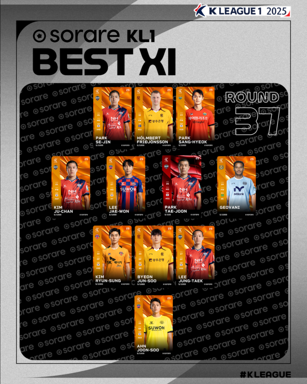 K리그1 37라운드 베스트 11에는 김천이 박세진, 김주찬, 박태준, 이정택 등 4명을 배출했다. 치열한 승부를 펼친 제주와 대구도 각각 김륜성과 지오바니를 베스트 11에 올렸다. 그밖에 프리드욘슨, 변준수(이상 광주FC), 이재원, 안준수(이상 수원FC), 박상혁(강원FC) 등이 베스트 11에 자리했다.