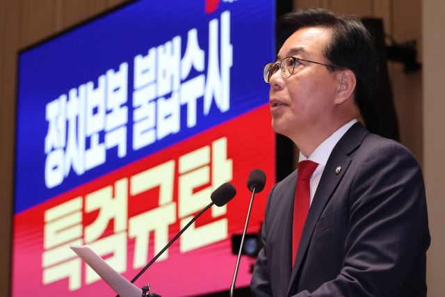 ▲국민의힘 송언석 원내대표가 27일 서울 여의도 국회에서 열린 의원총회에서 특검 수사를 규탄하는 발언을 하고 있다. 이날 국회 본회의에서는 계엄 해제 의결을 방해한 혐의로 내란 특별검사팀에 의해 구속영장이 청구된 추경호 의원에 대한 체포동의 요구서(체포동의안)를 표결한다. ⓒ연합뉴스