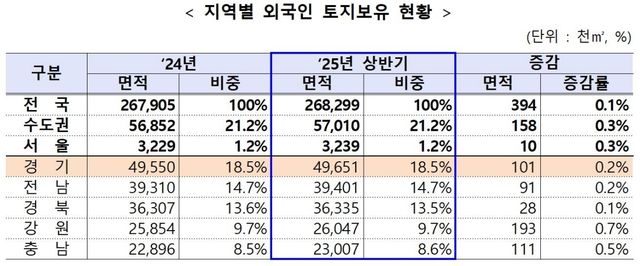 25년 상반기 기준 외국인 토지보유 현황 / 국토교통부 제공