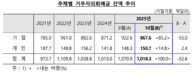 예금 주체별로 살펴보면 10월말 기준 기업예금 잔액은 867억 6000만달러로 전월비 55억달러 감소했다. 개인예금은 150억 7000만달러로 전월보다 2억 4000만달러 증가했다.