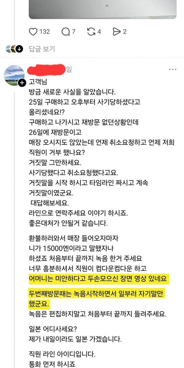 그리고 강한 항의로 환불을 받았다는 왜년들의 주장과 달리 실제로는 자기들이 가격을 착각해서 환불받은 걸 인정하고 있으며