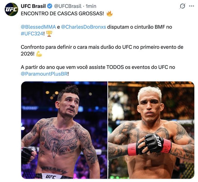 UFC 브라질의 X(구 트위터) 계정은 30일(한국시간) 맥스 할로웨이와 찰스 올리베이라의 BMF 타이틀전이 UFC 324에서 펼쳐진다는 공지를 게시했다.