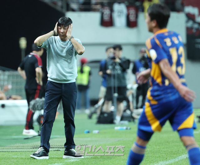 프로축구 '하나은행 K리그1 2025' 27라운드 FC서울과 울산HD의 경기가 24일 오후 서울 마포구 서울월드컵경기장에서 열렸다. 후반 신태용 감독이 어이없는 패스 미스에 머리를 감싸고 있다. 상암=김민규 기자 mgkim1@edaily.co.kr /2025.08.24/