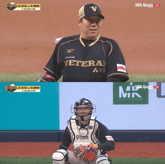 30일 서울 고척스카이돔에서 열린 '더 제너레이션 매치'. 팀 베테랑의 선발 투수 김현수와 포수 허경민. SBS스포츠 중계화면 캡처