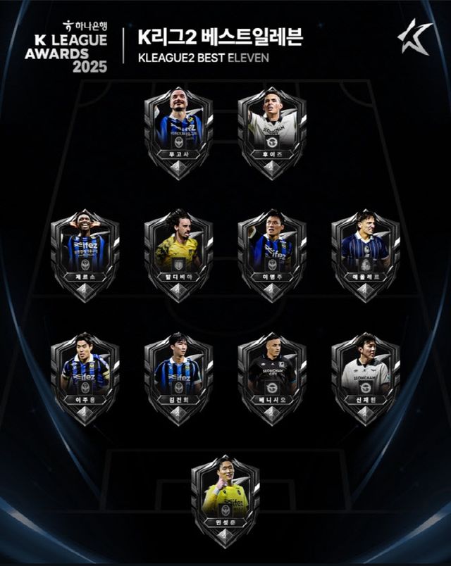 한국프로축구연맹은 1일 하나은행 K리그 2025 대상 시상식 행사에 앞서 K리그2 베스트 11을 발표했다. 리그 우승 팀 인천이 11자리 중 6자리를 차지했다.