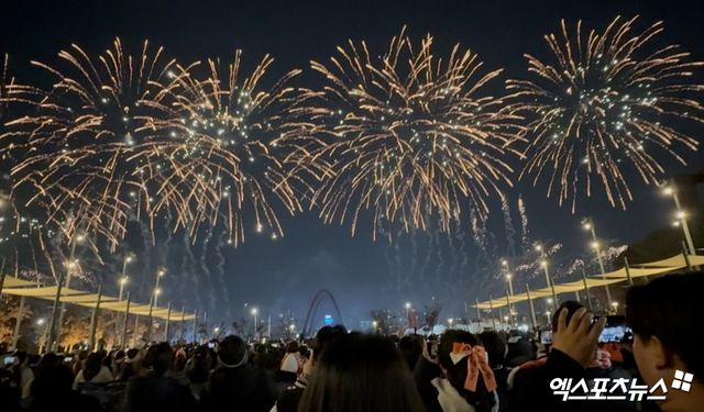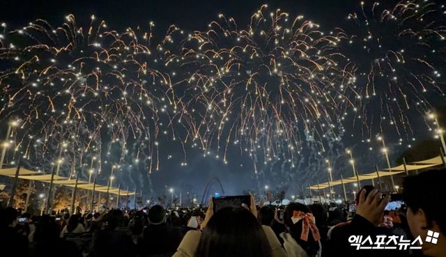 드론쇼에 이어 방탄소년단(BTS), 애니메이션 영화 '케이팝 데몬 헌터스' OST에 맞춰 화려한 불꽃쇼가 이어졌고, 밤하늘을 수놓는 불꽃에 시민들의 감탄이 끊이지 않았다.