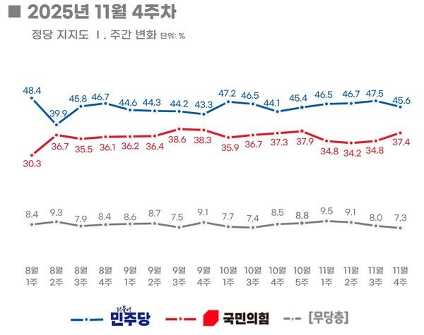 민주당은 당내에서 '당원 1인 1표제'를 둘러싼 논란과 친명계 내부의 반발 등으로 인해 지지율이 하락한 것으로 보인다. 반면, 국민의힘은 특검의 윤석열 전 대통령 기소와 추경호 의원 체포동의안 가결 등으로 대구·경북과 일부 보수층에서 결집한 것으로 나타났다.