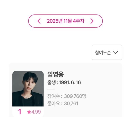 아이돌차트에 따르면, 지난 11월 24일부터 11월 30일까지 집계된 11월 4주 차 평점랭킹에서 임영웅은 30만 9,760표를 얻어 최다득표를 기록했다.
