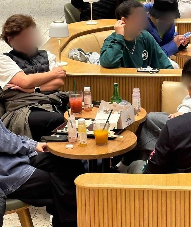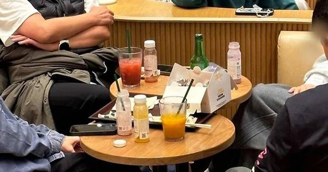 사진엔 6~7명으로 보이는 중국인 관광객들이 음료를 시키고 소주와 치킨을 먹으면서 웃고 떠드는 장면이 담겼다.