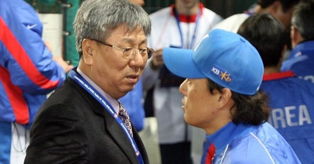 2008년 3월 8일 대만 타이중 인터콘티넨털 구장에서 열린 베이징올림픽 야구 최종 예선 2차전 한국과 호주의 경기가 끝난 뒤 덕아웃에서 아들 이승엽 선수와 이야기를 나누는 이춘광 씨. / 연합뉴스