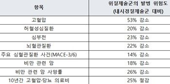 연구에 따르면 위절제술군은 내시경 절제술군에 비해 고혈압은 약 53%, 허혈성심질환·심부전·뇌혈관질환은 약 20%, 주요 심혈관질환 사건 발생률(MACE-3/6 지표)은 약 14% 낮게 나타났다.