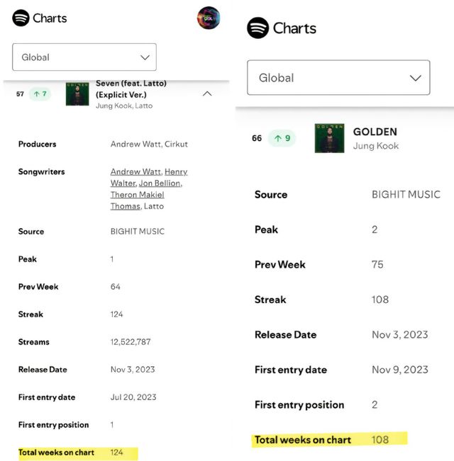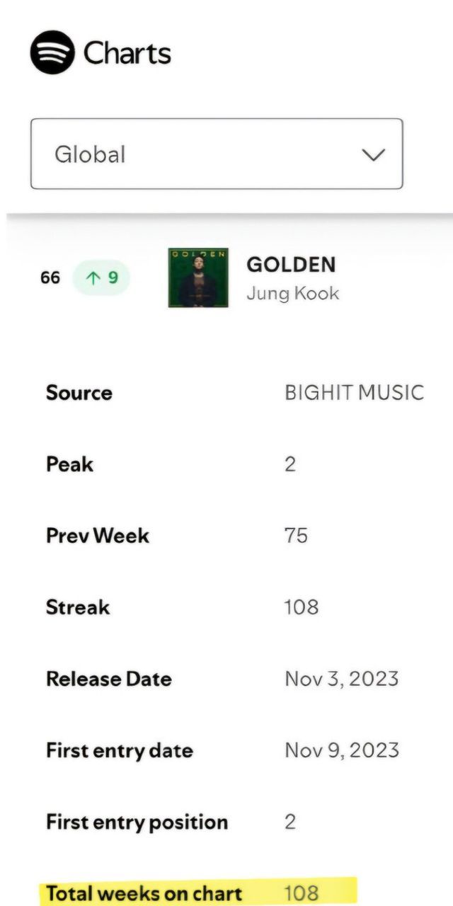 정국의 첫 솔로 앨범 ‘GOLDEN(골든)’ 역시 같은 기간 스포티파이 ‘위클리 톱 앨범 글로벌’ 차트에서 전주보다 9계단 오른 66위에 올랐다. 앨범 또한 아시아 솔로 가수 음반 중 유일하게 108주 동안 차트에 남아 있는 기록을 이어가고 있다.