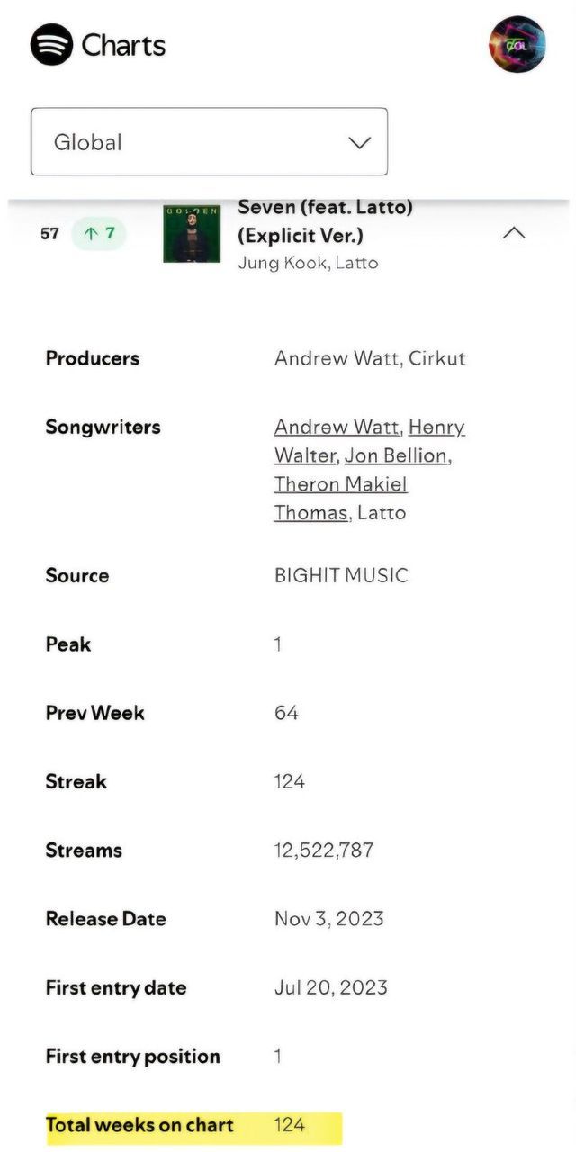 정국의 첫 솔로 데뷔곡 ‘Seven(세븐)’은 11월 21일부터 27일까지 집계된 스포티파이(Spotify) ‘위클리 톱 송 글로벌’ 차트에서 57위를 기록했다. 전주 대비 7계단 상승한 성적으로, 발매 후 해를 거듭해도 식지 않는 재생력을 보여줬다.