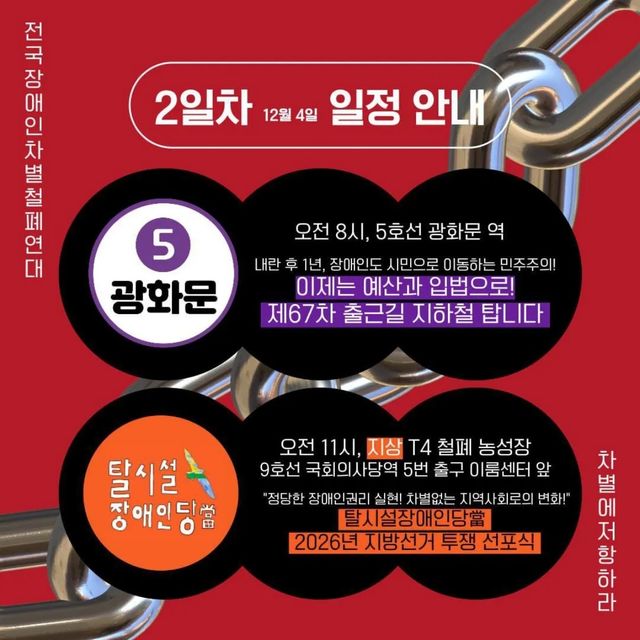 전국장애인차별철폐연대(전장연)는 ‘2025년 세계장애인의 날’을 맞아 이날 오전 8시 서울 지하철 5호선 광화문역에서 ‘제67차 출근길 지하철 탑니다’ 시위를 진행한다고 공식 홈페이지와 SNS를 통해 4일 공지했다.