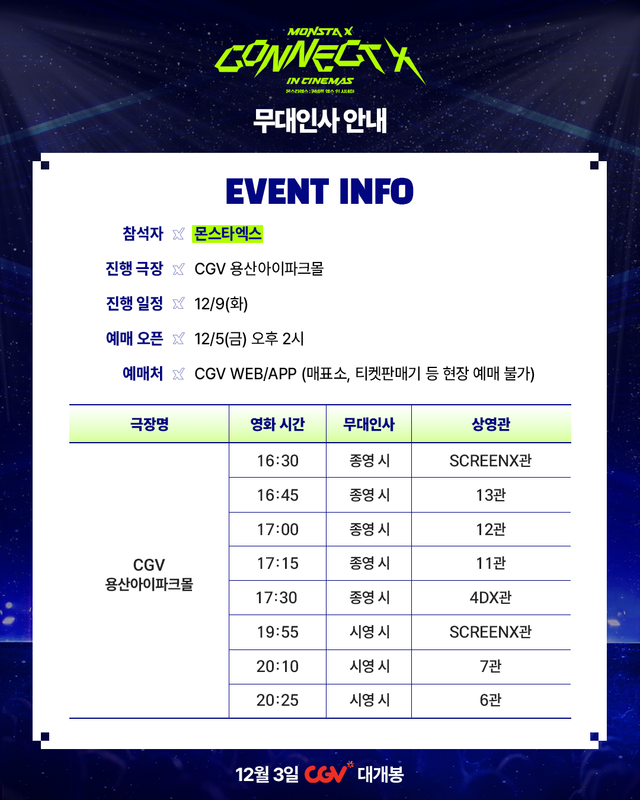 전 세계 50여 개국에서 개봉한 영화 ‘몬스타엑스 : 커넥트 엑스 인 시네마’는 SCREENX, 4DX, ULTRA 4DX까지 다채로운 포맷으로 절찬 상영 중이며 오직 CGV에서만 만날 수 있다.