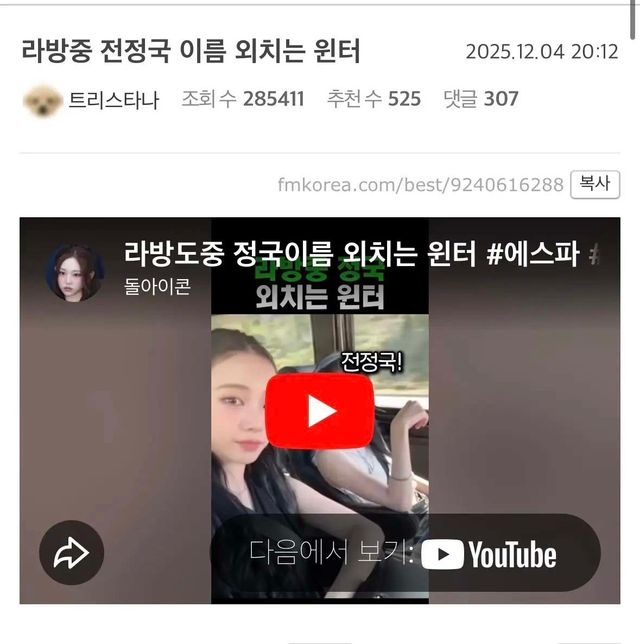 온라인 커뮤니티에는 ‘라방 도중 정국 이름 외치는 윈터’라는 제목의 영상도 게시됐다. 영상에는 윈터가 라이브 방송 중 "전정국"이라고 말하는 장면이 담겨 있다.