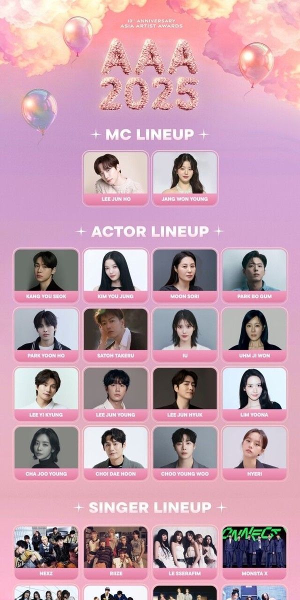 '10주년 AAA 2025'는 배우 부문에는 강유석, 김유정, 문소리, 박보검, 박윤호, 사토 타케루, 아이유, 엄지원, 이이경, 이준영, 이준혁, 이준호, 임윤아, 차주영, 최대훈, 추영우, 혜리가 참석한다.
