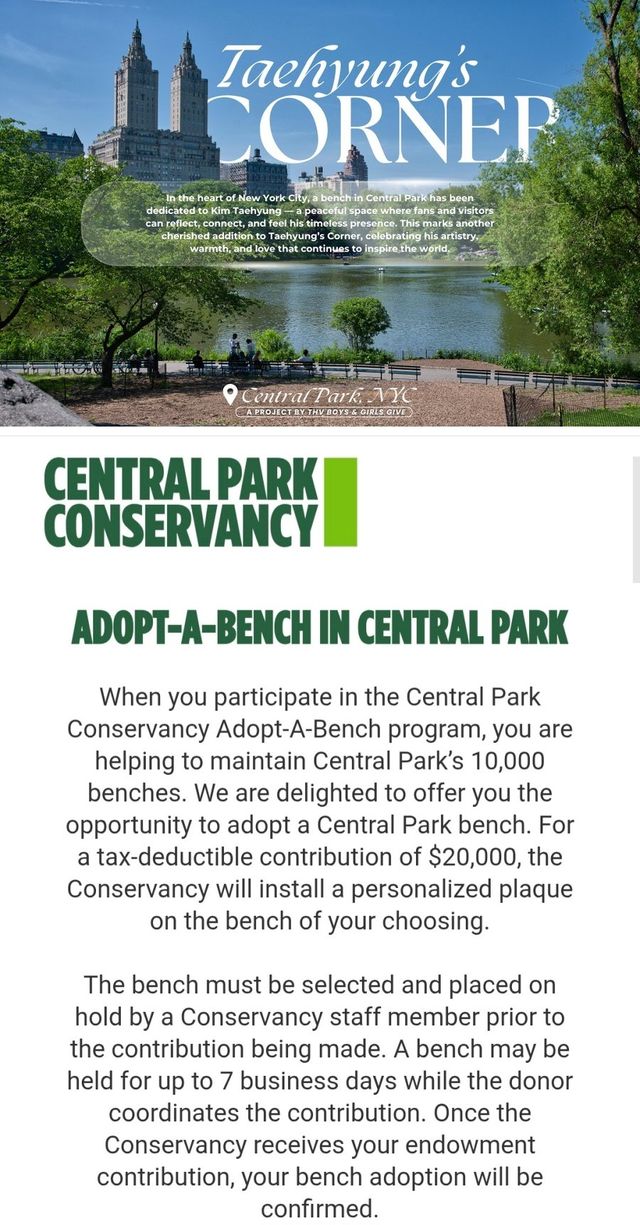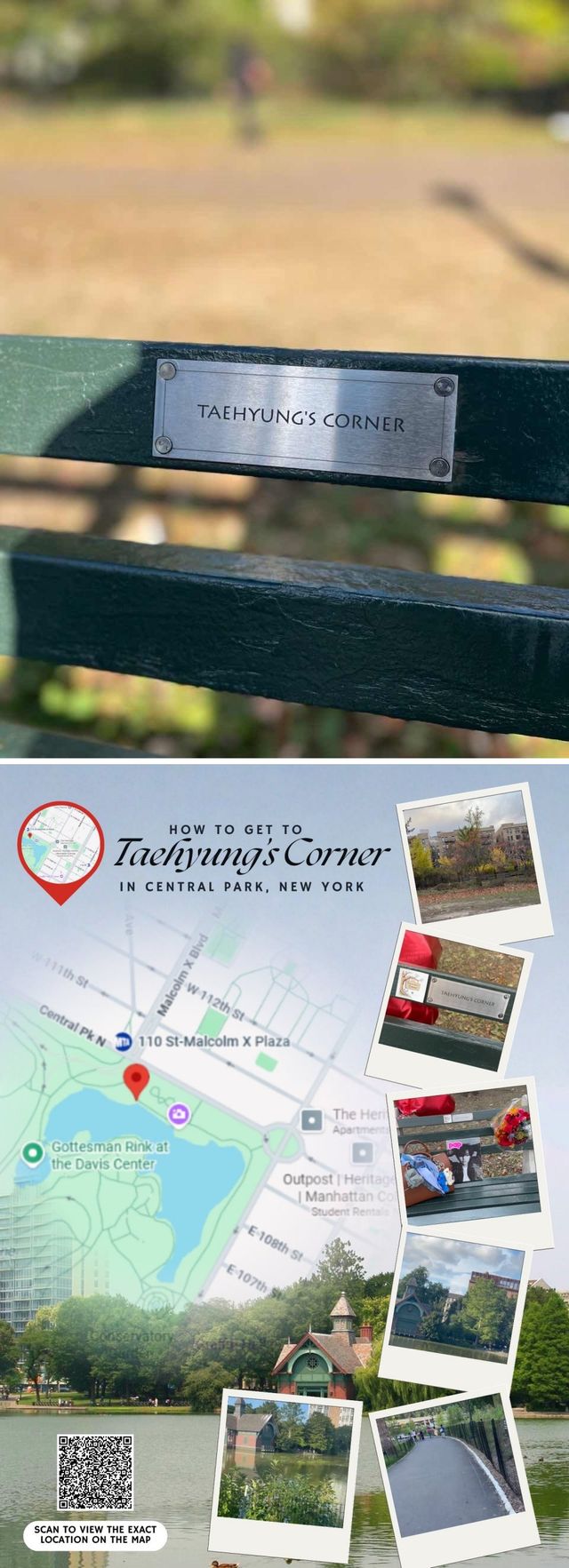 뉴욕 센트럴파크 한가운데, 방탄소년단(BTS) 뷔의 이름을 새긴 벤치가 조용히 자리를 잡았다.