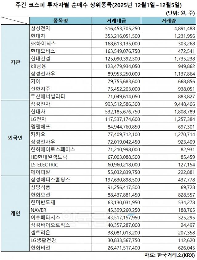 기관 '삼성전자'·외인 '삼성전자'·개인 '삼성에피스홀딩스' 1위 [주간 코스피 순매수- 2025년 12월1일~12월5일]