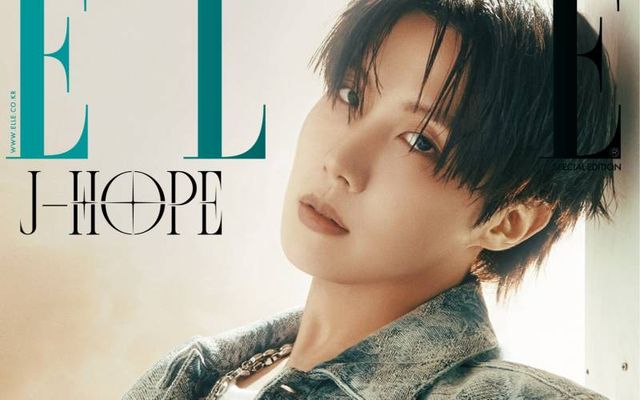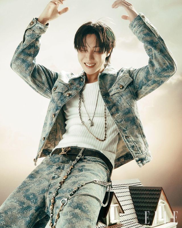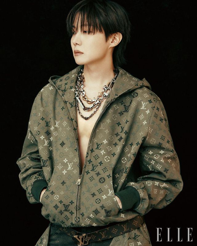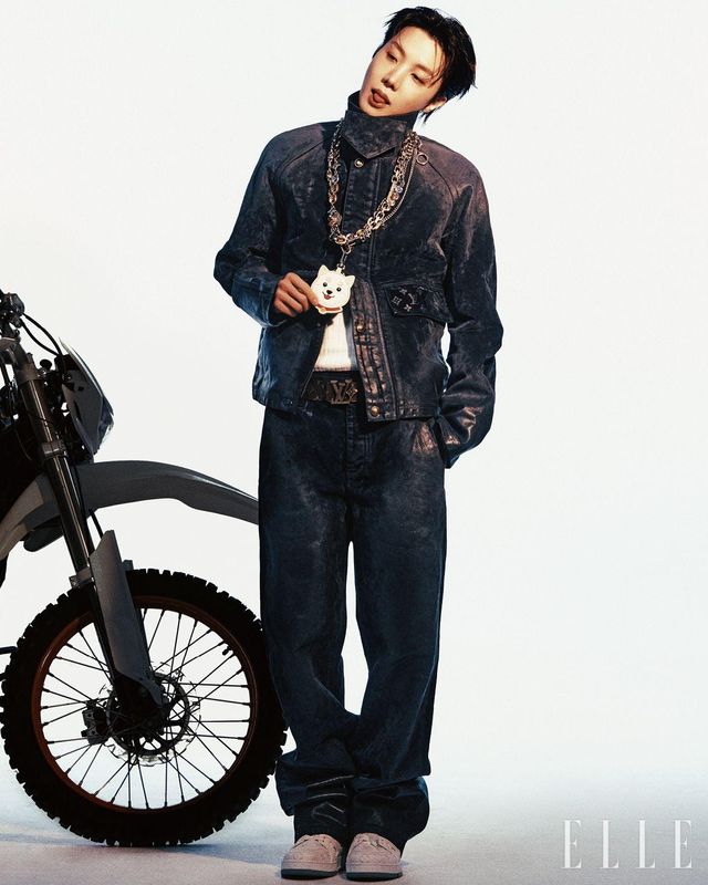 제이홉이 입은 모노그램 디테일이 있는 플로크 데님 재킷과 팬츠,네크리스로 연출한 체인 벨트와 LV 로고 벨트, 진돗개 모양 백 참, LV 트레이너는 모두 Louis Vuitton.