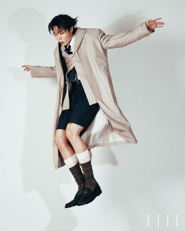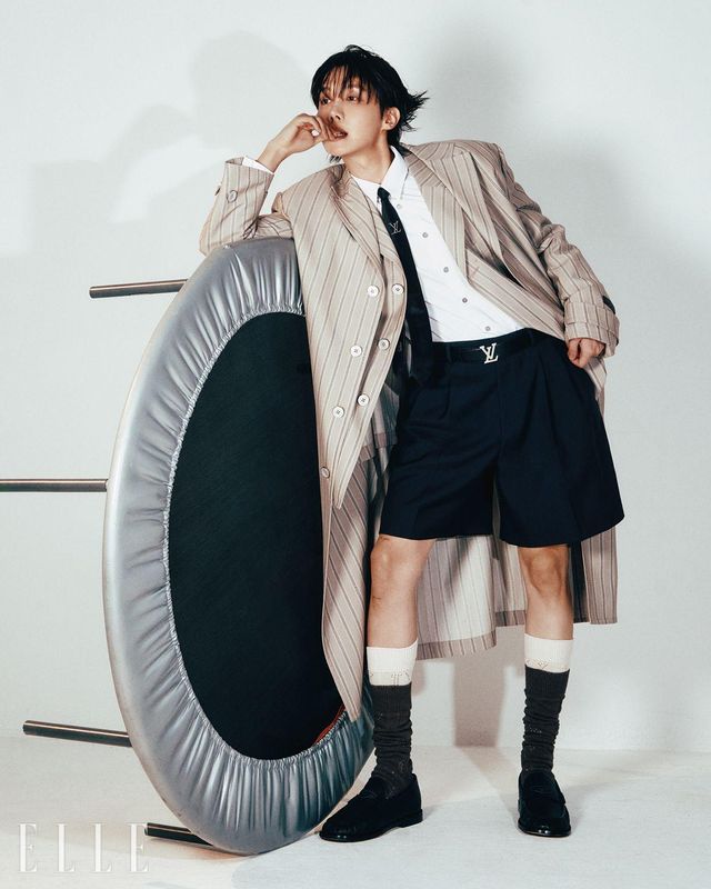 제이홉이 입은 스트라이프 패턴의 울 실크 코트와 재킷, 클래식 셔츠와 프레피 쇼츠, LV 펄 타이, 벨트, 모노그램 레이스 삭스, LV 재즈 로퍼는 모두 Louis Vuitton.